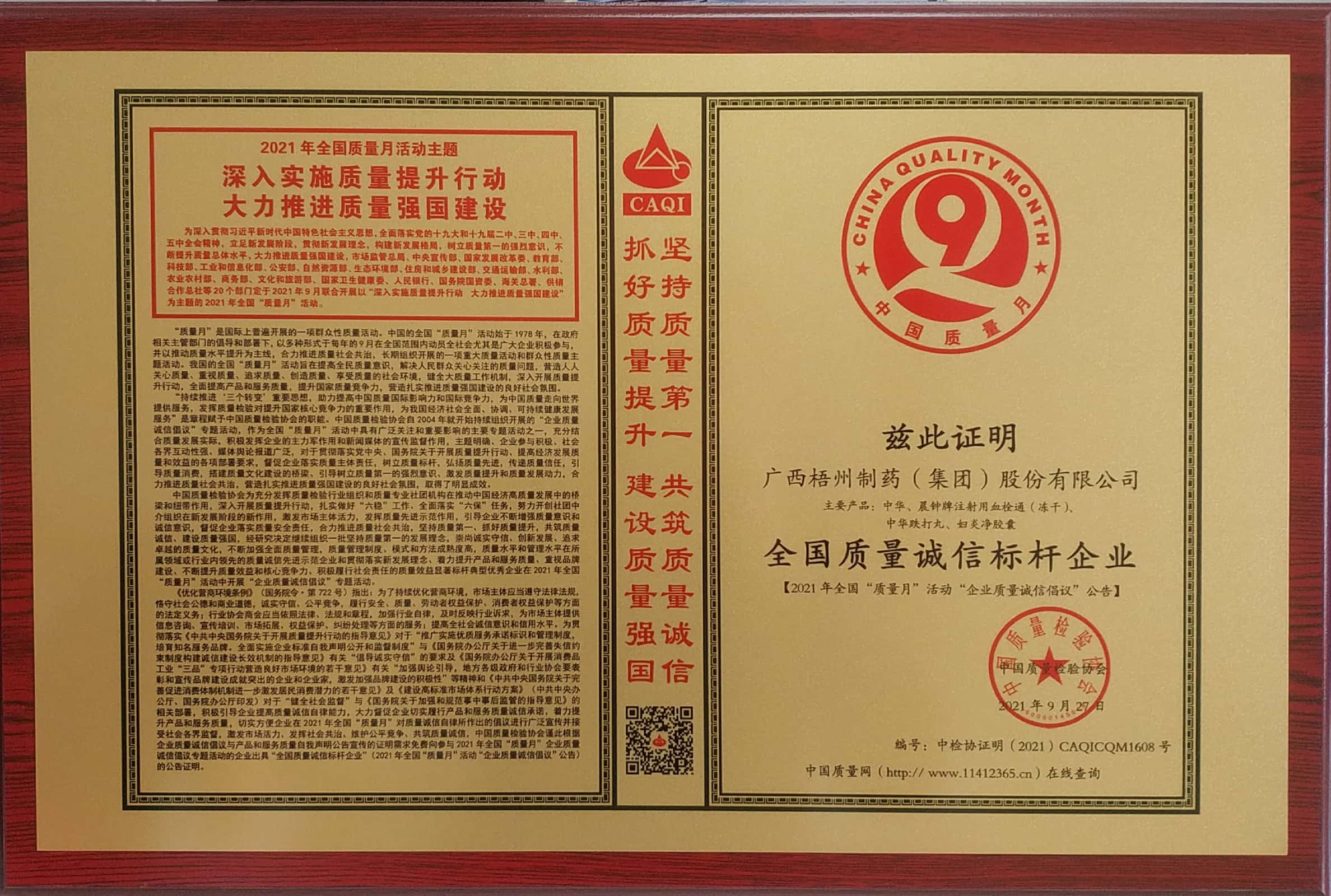 在2021年全國"質(zhì)量月"活動中榮獲 全國質(zhì)量誠信標(biāo)桿 企業(yè)稱號。