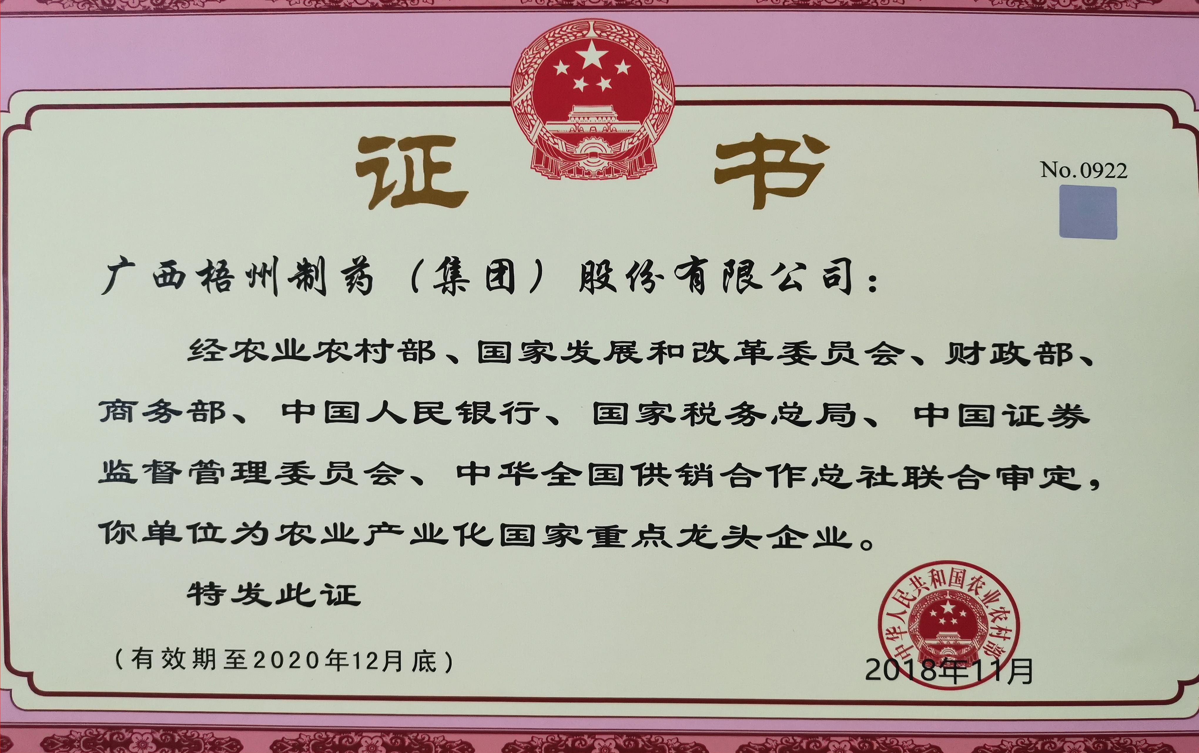 經(jīng)農(nóng)業(yè)農(nóng)村部、國(guó)家發(fā)展和改革委員會(huì)、財(cái)政部、商務(wù)部、中國(guó)人民銀行、國(guó)家稅務(wù)總局、中國(guó)證卷監(jiān)督管理委員會(huì)、中華全國(guó)供銷合作總社聯(lián)合審定,評(píng)為農(nóng)業(yè)產(chǎn)業(yè)化國(guó)家重點(diǎn)龍頭企業(yè)。