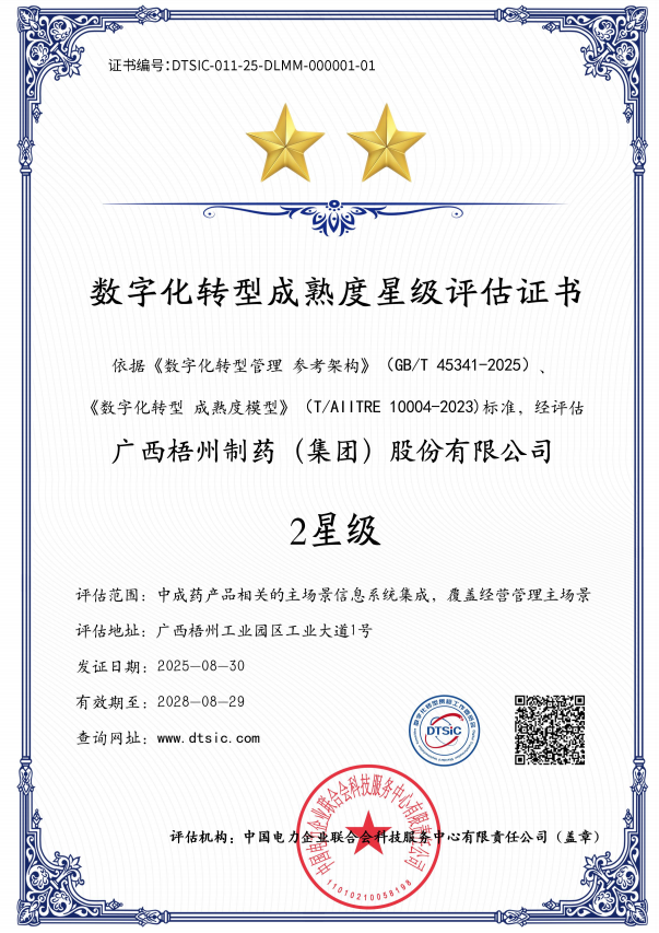 近日,數(shù)字化轉(zhuǎn)型貫標工作委員會公布第十九批數(shù)字化轉(zhuǎn)型貫標星級評估結(jié)果,廣西梧州制藥(集團)股份有限公司憑借扎實的轉(zhuǎn)型實踐與顯著成效,成功獲評數(shù)字化轉(zhuǎn)型成熟度2星級認證,成為中醫(yī)藥行業(yè)數(shù)字化轉(zhuǎn)型進程中的優(yōu)秀代表。該榮譽不僅是對企業(yè)過往轉(zhuǎn)型工作的權(quán)威認可,更為行業(yè)同仁推進數(shù)字化轉(zhuǎn)型提供了可參考的實踐路徑。